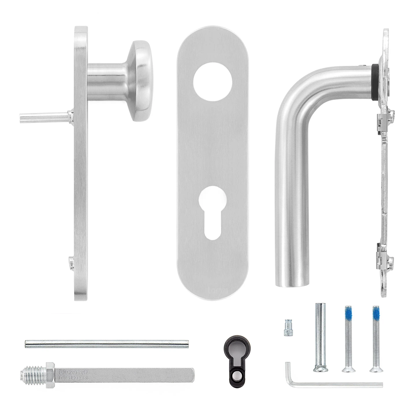 - Innendrücker, gerade Form, Typ D210, abgerundetes Kurzschild, PZ-gelocht, Edelstahl