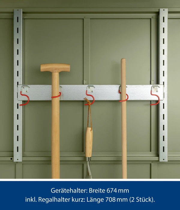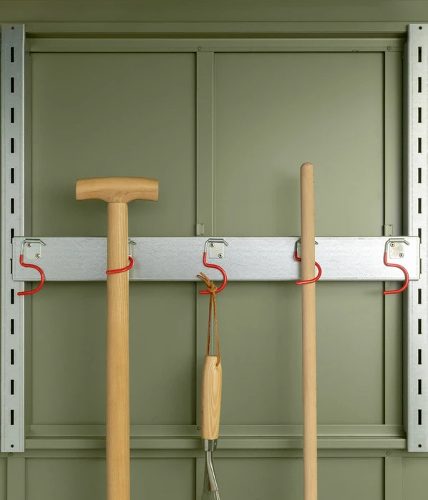 Sie schätzen Ordnung in Ihrem Gerätehaus und wünschen sich eine solide Lösung für die Verwahrung von Schaufeln, Rechen und Besen? Mit dem Hörmann Gerätehalter-Set haben Sie Ihre Arbeitsgeräte stets übersichtlich griffbereit! Dieses attraktive Set ermöglicht Ihnen, die Wände Ihres Berry-Gerätehauses als Aufbewahrungsort zu nutzen. So sparen Sie Platz und schaffen dabei Freiraum und Stellfläche am Boden.