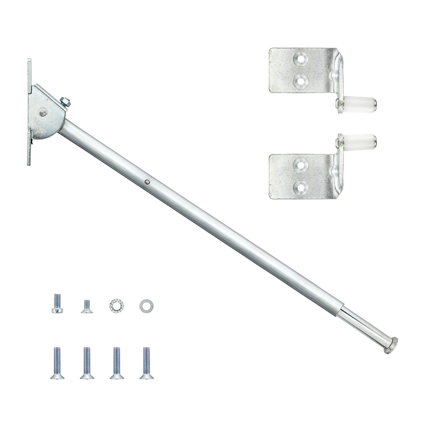 Ein Hörmann mechanischer Schließfolgeregler, Basis 2 besteht aus einem ausklappbaren, gefederten Ausleger, der am Türrahmen angebracht wird und zwei Stützwinkeln, die sich an den Türflügeln befinden. Der Ausleger ist außerdem mit einer gekonterten Einstellschraube ausgestattet, womit sich dessen Auslegewinkel verstellen lässt. Wird der Standflügel geöffnet, so klappt sich der Ausleger aus. Dieser blockiert über einen der zwei Stützwinkel den Gangflügel und verhindert so dessen Zugehen. Erst wenn der Standflügel fast geschlossen ist, drückt der daran angebrachte zweite Stützwinkel den Ausleger gegen die Wand, wodurch sich dann auch der Gangflügel schließen kann.