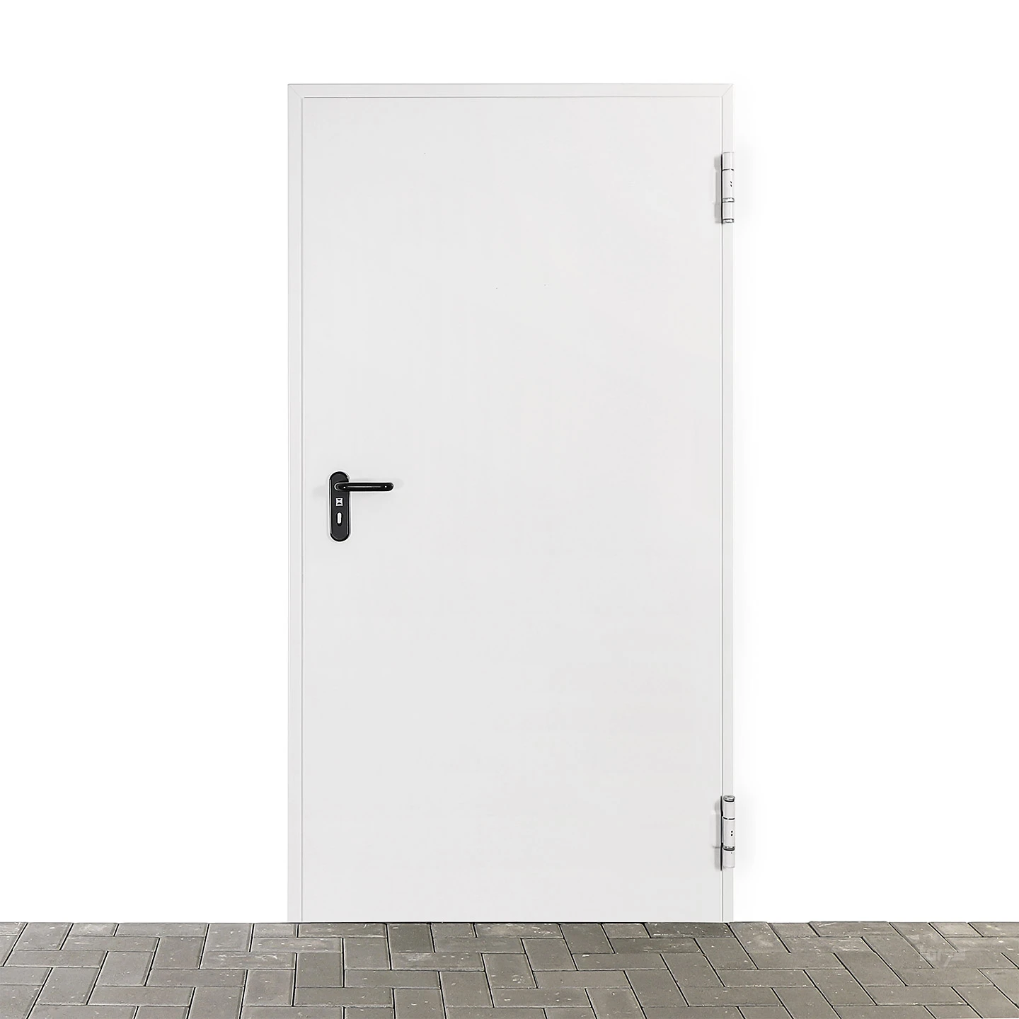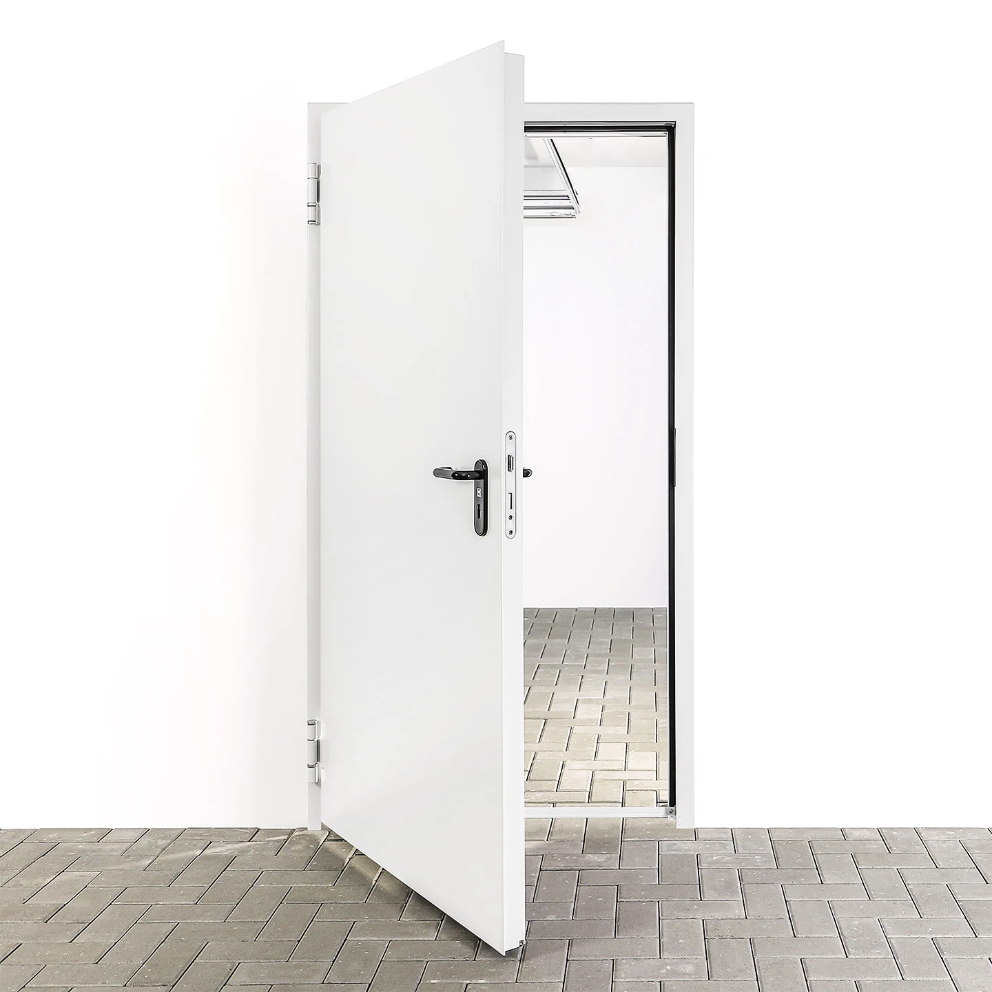 | Oberfläche Türblatt und Zarge | verzinkt, grundiert (pulverbeschichtet) in Grauweiß, ähnlich RAL 9002 |