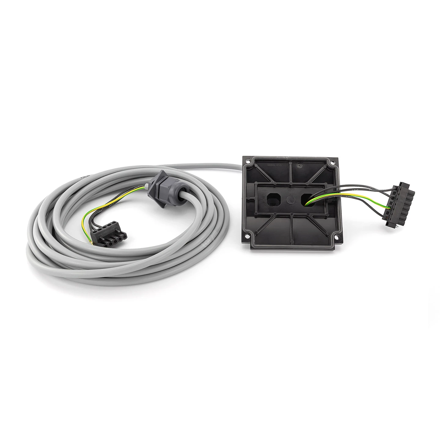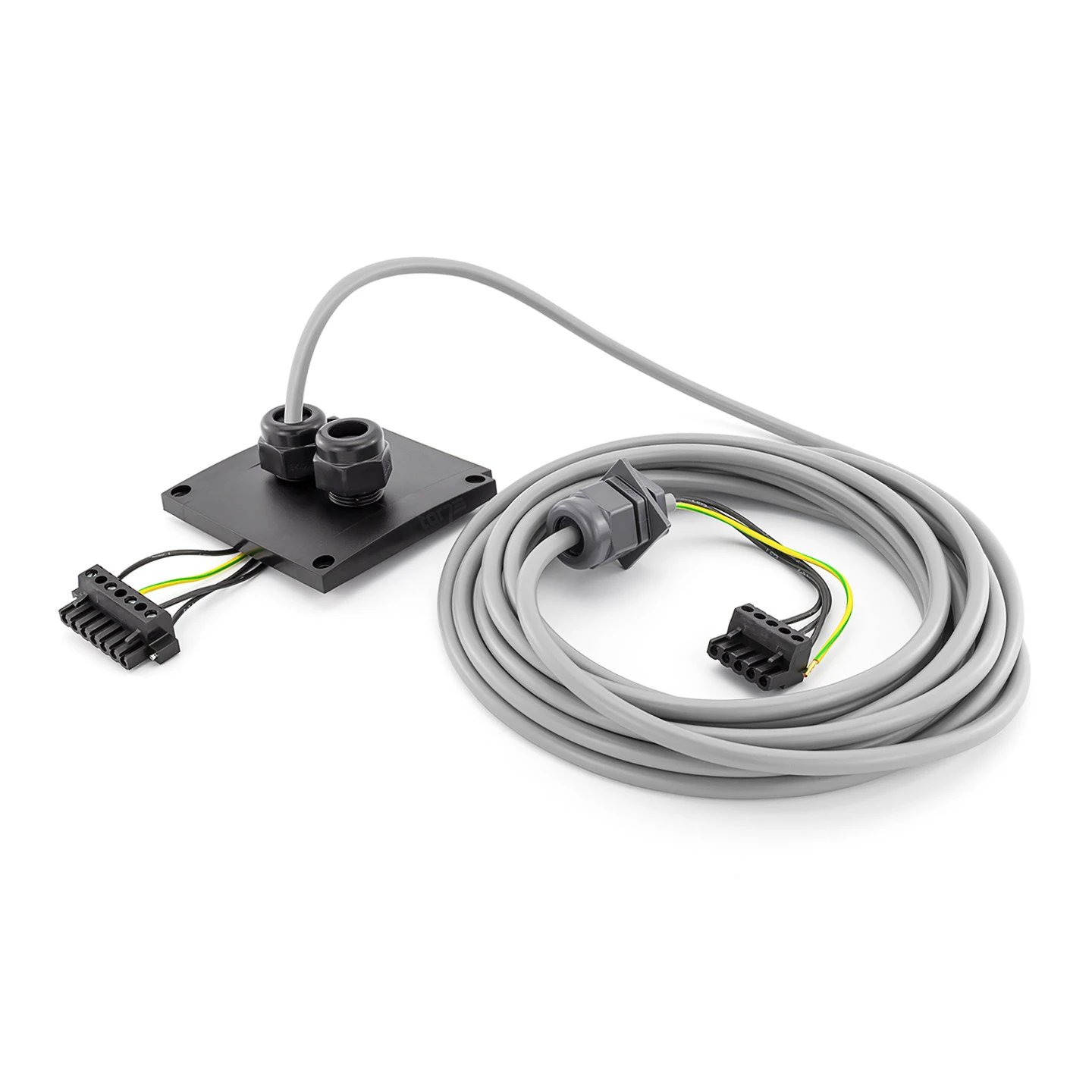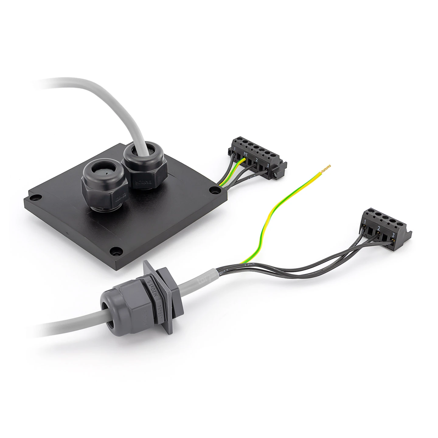 Es handelt sich um eine fertig vormontierte Motoranschlussleitung, welche bereits durch einen Gehäusedeckel (90 x 92 mm) gezogen und mit zwei Schraubklemmen (dreipolig und vierpolig) versehen ist. So kann diese ohne großen Aufwand montiert oder ausgetauscht werden.