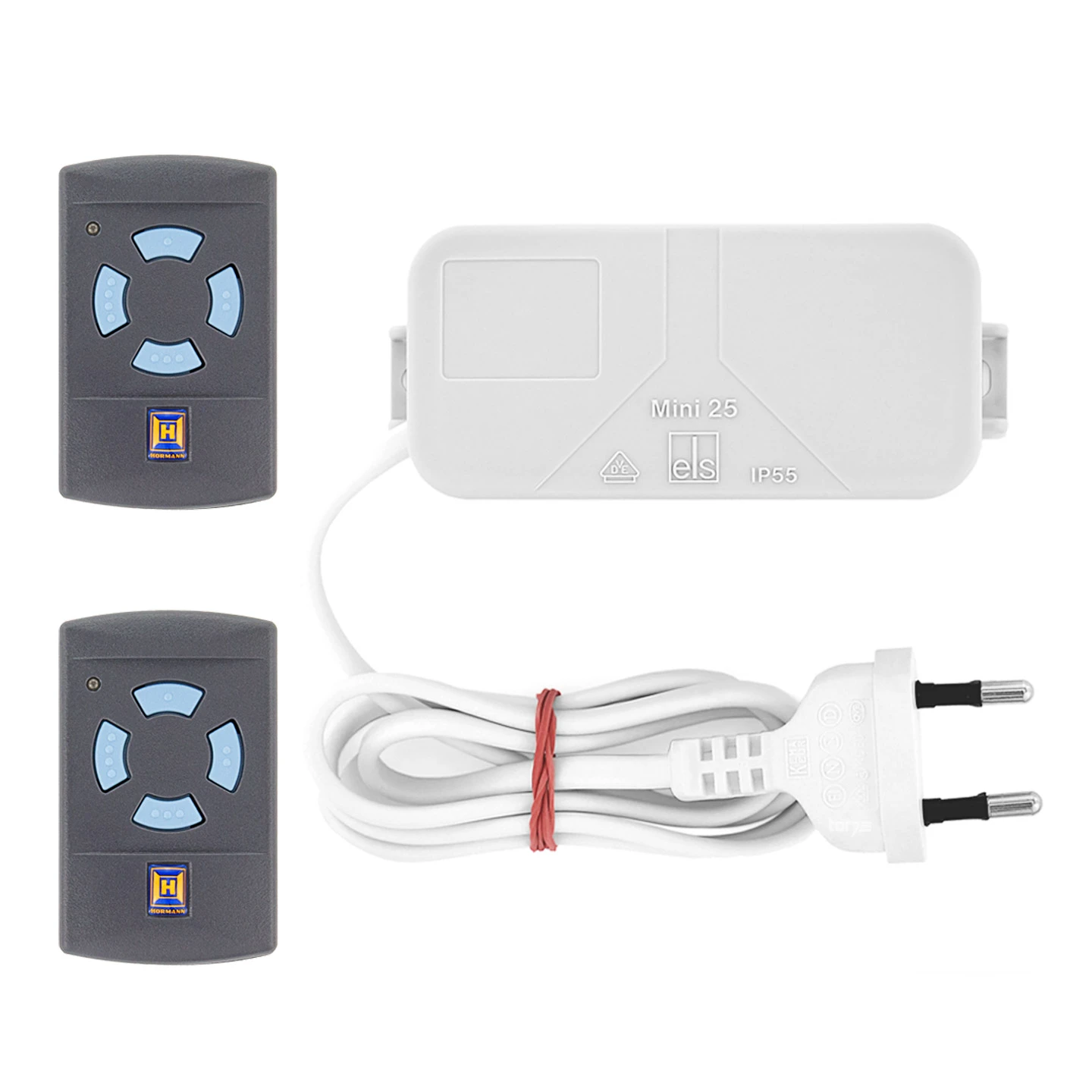 Mit dem Set, bestehend aus dem Hörmann 2-Kanal-Relais-Empfänger HET 2, 868 MHz und den beiden Hörmann Handsender HSM 4, 868 MHz, kann Ihr Antrieb kostengünstig auf den Hörmann-Funkstandard 868 MHz Festcode umgerüstet werden. Insgesamt sind bis zu zwei Antriebe bzw. Geräte an den Empfänger anschließbar. Der Empfänger ist in einem separaten Gehäuse aus Kunststoff untergebracht und verfügt über eine einen Meter lange Anschlussleitung mit Eurostecker. Über die zwei Hörmann Handsender HSM4 lässt sich der Empfänger HET2 ideal bedienen.