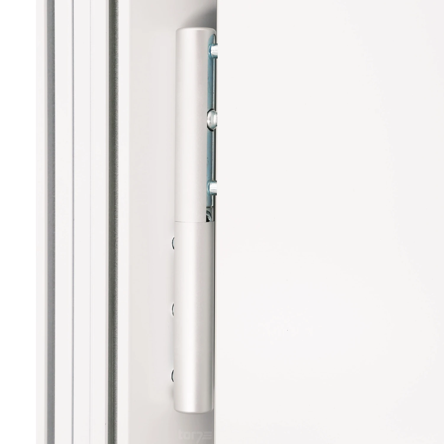 Die zweiteiligen, dreidimensional verstellbaren, stiftgesicherten Rollenbänder sorgen für ein leichtes Öffnen und Schließen der Haustür und ermöglichen optimale Einstellmöglichkeiten. Abdeckkappen in Edelstahl-Optik runden die gelungene Gesamtansicht ab.