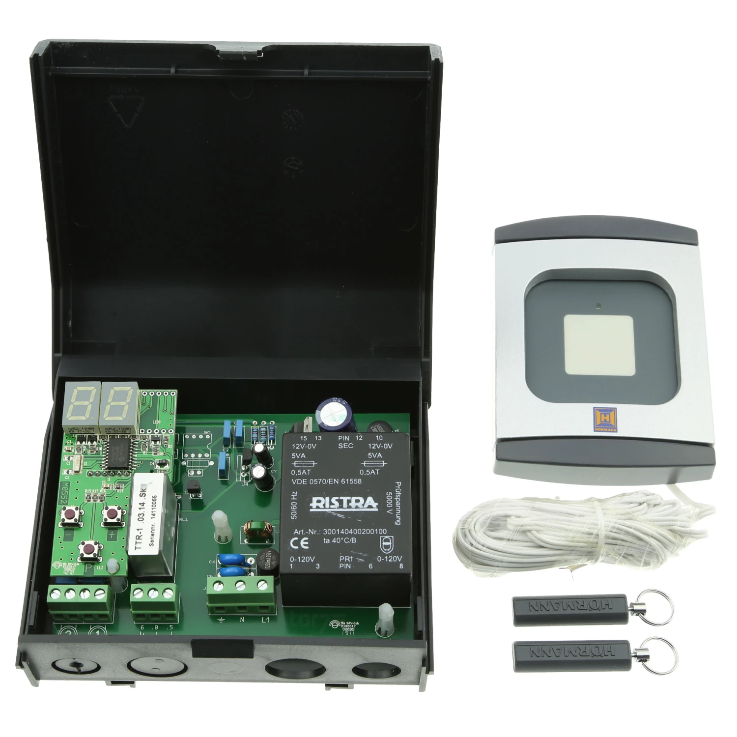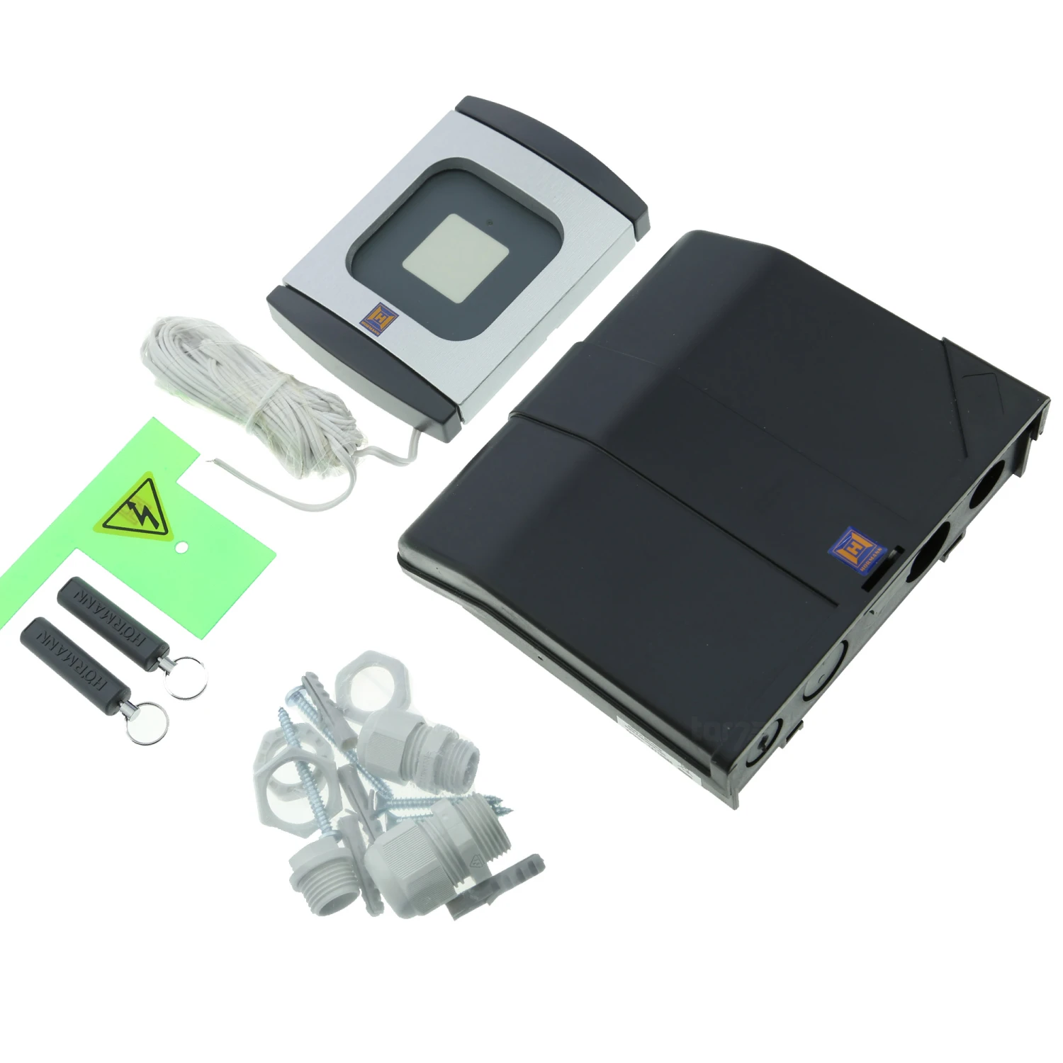 Im Lieferumfang des TTR100 von Hörmann sind zwei Transponderschlüssel, eine Leseeinheit und eine Auswerteinheit enthalten. Es besteht auch die Möglichkeit, eine zweite Leseeinheit anzuschließen.