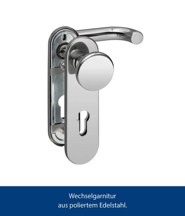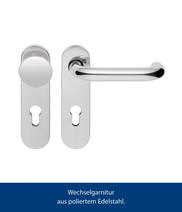Sie sind auf der Suche nach Upgrades für Ihr Berry-Gerätehaus? Die Wechselgarnitur von Hörmann ist die ideale Wahl, um Ihrem Gerätehaus eine moderne Note zu verleihen. Mit ihrem ansprechenden Design und der hochwertigen Verarbeitung aus poliertem Edelstahl wird sie zum Blickfang an Ihrer Tür. Das glänzende Finish verleiht Ihrem Eingangsbereich ein elegantes Erscheinungsbild und setzt einen stilvollen Akzent. Die Wechselgarnitur sorgt für einen beeindruckenden ersten Eindruck und macht Ihr Berry-Gerätehaus zu einem attraktiven und einladenden Ort.